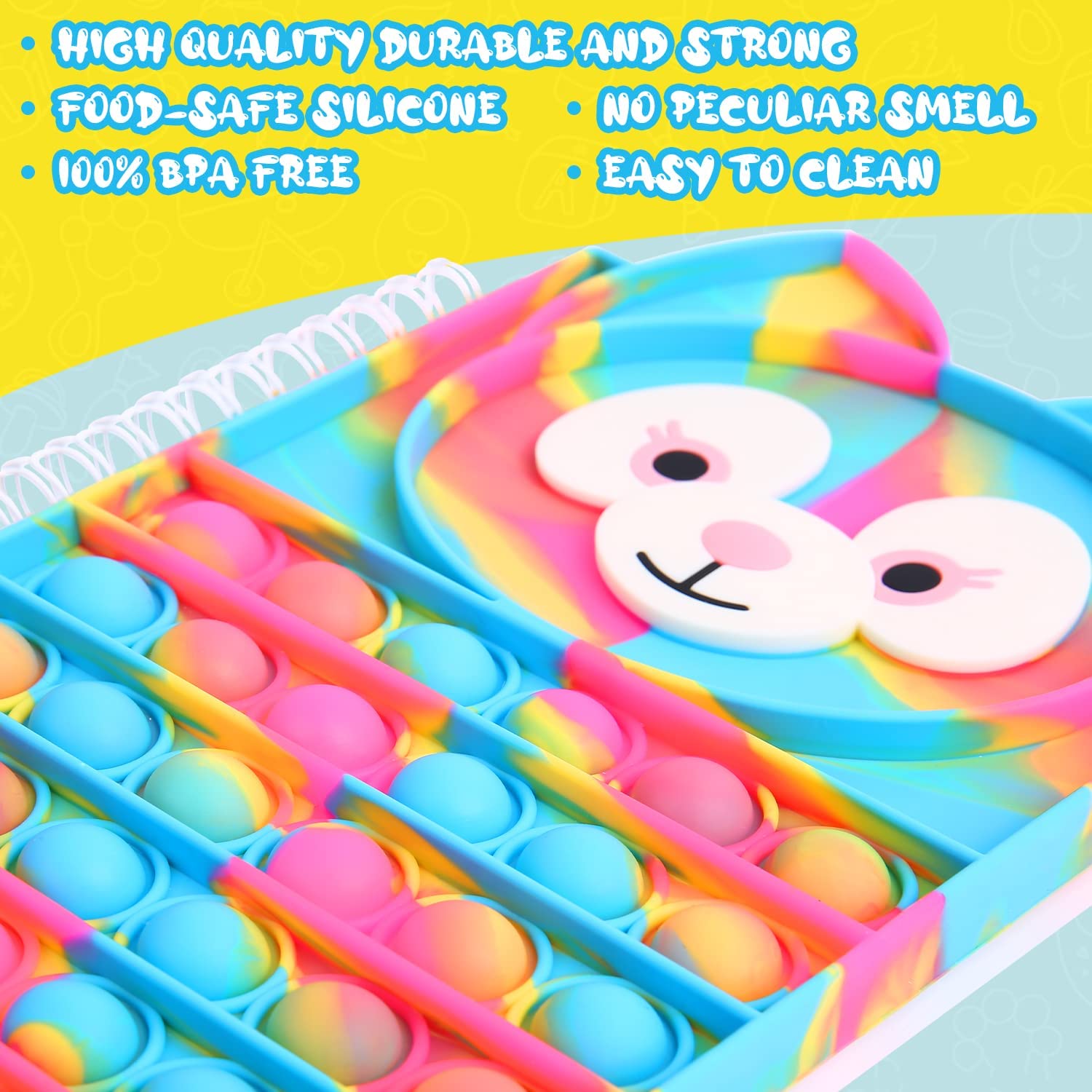- 🌈【100% BPA FREE】 Our pop fidget notebook undergo a strict, officially controlled quality process, it's conform to all safety standards and cover are made of food-safe silicone with no bad odour, which is not harmful to the health of humans or animals.